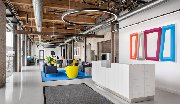 The architect utilized the site’s past in bookbinding to create a united brand palette. Black-and-white color blocking breaks up hallway lengths, and a hot pink anamorphic projection cuts through the underground tunnel that connects the buildings. The interior design team carried the ethos into public spaces with pop-art stylings against an industrial backdrop.