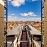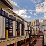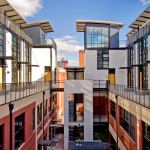 Rather than razing and rebuilding, Kirkdil’s strategy was one of shrewd addition. Keeping the site’s original footprint intact, the design team converted the warehouses into parallel volumes of two-story townhomes, topped them off with a layer of flats, and then tacked on a nine-story new building at one end with 30,000 square feet of ground-floor retail space. An open gallery bisecting that retail space becomes the gateway to what now reads as an urban micro-village. Its central paseo takes on a romantic quality with its attractive hardscaping and open-air canopy of third-story bridges and suspended streetlights.
