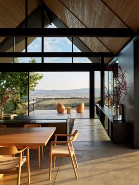 Each of the three gabled structures houses a family member’s study, providing them with secluded spaces, while the living room and dining room encourage togetherness. The kitchen, where the family enjoys preparing and plating fresh food, welcomes the clients’ passion for farm-to-table dining. “To have designed the highly ergonomic ‘cooking cockpit’ that spills out to a dining room with remarkable views of the surrounding vineyards and satisfies our clients’ desires is quite rewarding,” says Aidlin.
