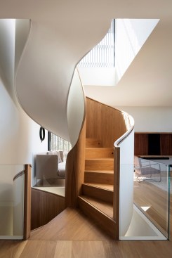 “[The staircase] sort of strings those narrow volumes together, and it worked well because it was a very small footprint,” says Masi. “There’s a kind of seductive form to it. It really became this beautiful feature.”