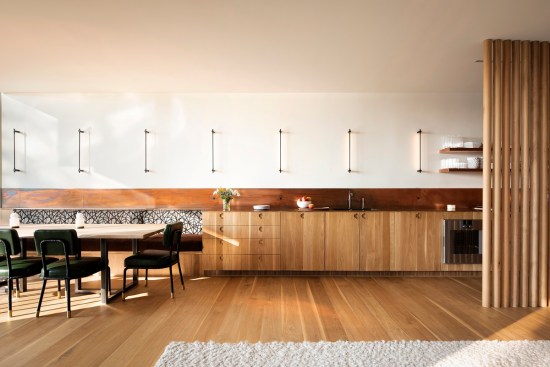 To further protect resident privacy from its close neighbors, an arrangement of privacy walls were designed for the home’s sides. These walls extend above and beyond the volumes and are clad in tiers of copper piping with flattened ends to resemble oars. Each vertical pipe telescopes, providing variable lengths to precisely follow the sloping topography.