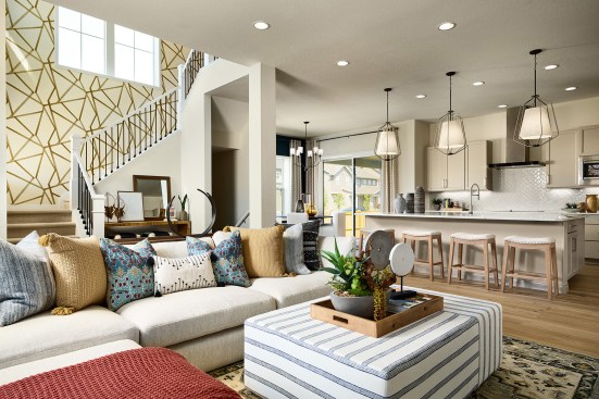 Targeting move-up buyers, the two-story Revive model features 2,522 to 3,393 square feet, three to five bedrooms, three-and-a-half to four-and-a-half bathrooms, and a three-car garage. The plan—designed by architecture firm DTJ Design—is offered in two elevations, farmhouse and Craftsman, and includes a 42-foot-wide covered front porch to welcome homeowners and their guests into the home.