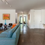 White walls and millwork reflect the light coming in primarily from north- and south-facing sliding doors.