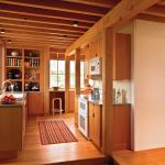 Snowy winters and the house’s exposed location influenced its interior as well. Rather than oversized spaces, the owners opted for cozy, easily heated, single-story rooms. The nearly square first-floor plan is largely open, with interior partitions limited to two box-like volumes, one containing pantry storage and the other a powder room and the stair to the second floor. Painted white, in contrast to the exposed fir framing and cabinetry, these “cubes” organize the plan into a series of functional areas without creating closed rooms. “The way the cubes sit, you kind of flow around them,” Griffin says. “You’re in one room, but you’re not in a one-room cabin.” The cubes rise to railing height at the second floor, surrounded by open space “to get more bounced light inside the house” from skylights above. Reinforcing the presence of the great roof, second-floor rooms are open to the structural framing overhead.