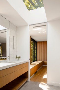 The bedroom was reoriented and connected both materially and visually to the attached bath. A natural palette was one of the highest priorities. The whole suite is clad in a warm white oak wrapper, punctured by windows and a wool-wrapped headboard wall. Additional natural materials include paper yarn carpet, clay tiles, concrete countertops, and locally sourced recyclable wallpaper.