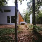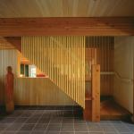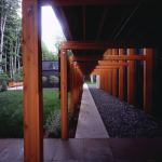 The house brackets its barlike length between end walls of white masonry that Salmela likens to “white swans on black water.” An exposed structure of laminated columns marches the length of the building, which steps downhill toward the lake. Terracelike levels define spaces both indoors and outdoors, where sculptural elements—a freestanding chimney, a sauna, and a pavilion one judge dubbed “the Mystery Critter”—draw one out into the landscape.