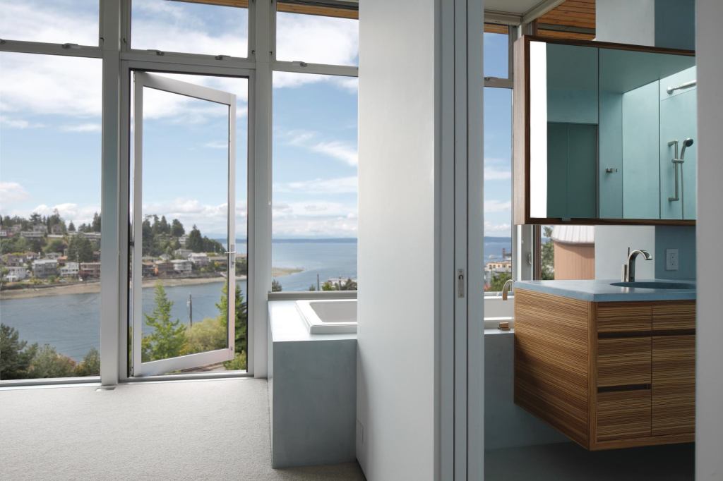 Bathing in the bedroom is a binary decision; there are those who like it and those who emphatically do not. Ballard Cut’s owners are in the former camp, and Wickline obliged by locating a tub at the window wall, where the view angles are widest. Set in a concrete plaster base, and positioned as a hinge point between the bedroom and bathroom, it promotes soaking as a social pursuit. “From the bathroom, it feels like the tub is part of the bathroom, but it’s also open to the bedroom,” Wickline says. “You can access the tub from both spaces.”