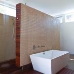 A freestanding partition faced in ceramic tile and edged in spaced ipe boards backdrops a ceramic vessel tub while screening a generous walk-in shower and a separate toilet compartment. A section of ipe decking, flush with the limestone tile floor, drains the shower and any spillover from the tub. High windows brighten the room, which opens onto a screened courtyard.