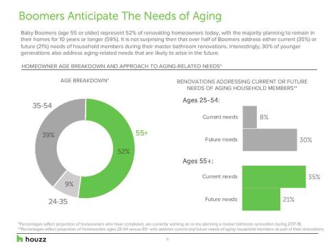According to the 2018 Houzz Bathroom Trends Study, over half (56%) of baby boomer homeowners are addressing aging-related needs during master bathroom renovations. The digital residential design platform surveyed over 1,100 U.S. homeowners using Houzz who are in the midst of, are planning, or recently completed a master bathroom renovation, and found that one-third of boomers are addressing current aging needs, while nearly a quarter are planning ahead for future needs (22%).