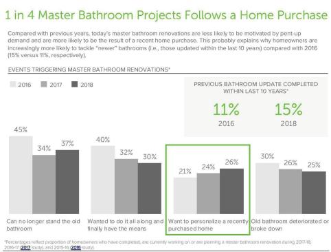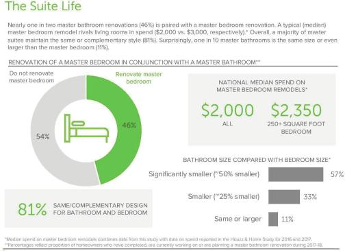 Homeowners are also focusing on their master suites as a whole, with nearly half of master bathroom projects accompanied by master bedroom renovations (46%). Master bathrooms command the second highest median spend in home remodels, behind kitchens, at $7,000. Median spend for a major renovation of a large master bath jumps to $16,000. Meanwhile, master bedroom renovations saw a 33% increase in median spend last year from $1,500 to $2,000 (in 2016 and 2017, respectively).