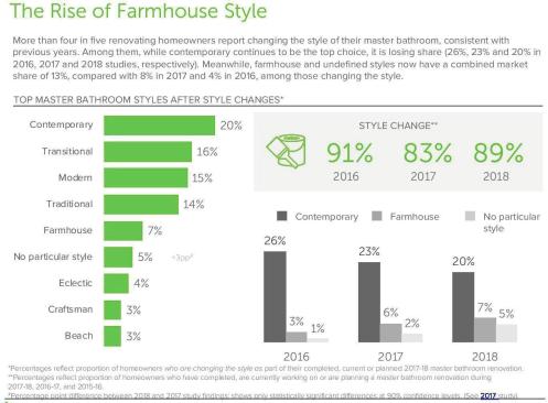 - A Rise in Farmhouse Style: Contemporary style continues to be the leading choice among renovating homeowners, despite its drop in popularity over the past three years. Farmhouse style, on the other hand, has more than doubled in popularity from 3% in 2016 to 7% in 2018.