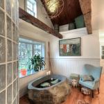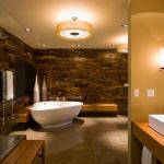 This 5,500-pound, solid granite tub was an eBay find that the homeowners fell in love with. A challenge? You bet. Floor boards were scribed two to three times to make sure they fit perfectly around the massive focal point. The lower third of the tub is below floor and wrapped in a radiant loop. Designer/Builder: Jarrett Kravitz, Advantage Contracting