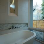 Expanding the views yet creating privacy from the street was key for this entire remodel, bathroom included. The house has a 5,000-gallon rainwater collection system and a five-star rating from the Austin Energy Green Building program. Architect: Rodney Palmer, Cornerstone Group Architects; Builder: Chris Shaffer, Greenbelt Homes