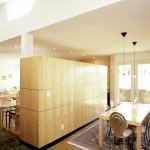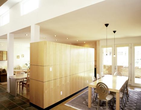 Living space consists of three bedroom suites, one for each generation, surrounding a single great room. “The floor plan is very compact,” says architect Jon Anderson. But with all group functions combined in a single generous space, “It still feels like there’s lots of room.” To further stretch the budget, Anderson adopted a two-tiered approach to materials. Simply detailed gypsum board walls, stock windows, and solid-core slab doors form a receding backdrop for the bolder gestures of a maple-veneered room divider and a circulation spine tiled in slate. “Jon strategically placed nice things here and there,” says builder Paul Kenderdine. “It makes the house look great, but it’s fairly inexpensive. The fixtures and finishes are very simple.” And with its slab foundation and stucco-on-stick-frame shell, it was “as easy to build as any tract house.”