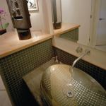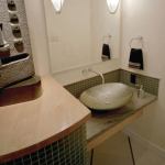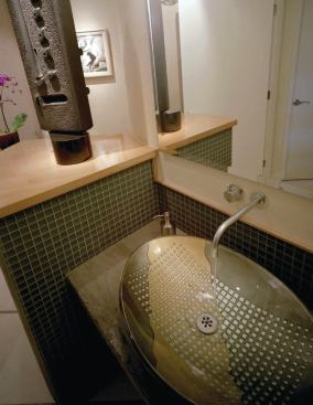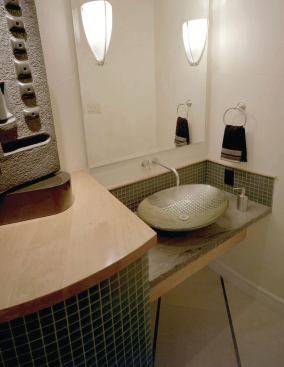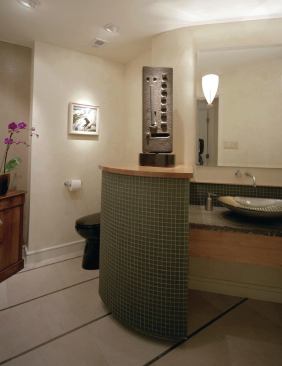 So it wasn’t too surprising that rerouting that powder room entry became a priority when new owners moved in. Their intent in remodeling was not just to fix that plan glitch, but also to create display space for their extensive art collection. The new bath is arguably a work of art in its own right.