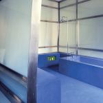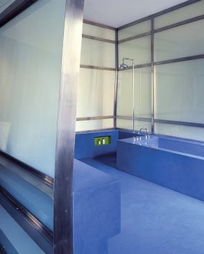Dubbledam’s concept of overlapping zones and spatial connectivity is most apparent in the master bath. “I took everything a bathroom needs and wrapped a low surface around all of those—two sinks, tub, toilet.” The Aegean blue topographic form is made of a light wood frame wrapped in fiberglass and coated in a thin layer of waterproof structural cement plaster. The unit was built upside down like a boat, then inverted into place. The floor is also coated in the same waterproof plaster to accommodate a freestanding shower.