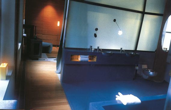 Lighted niches of pale green glass tile pierce the blue surface. Stainless steel sinks and an institutional steel toilet preserve the loft’s industrial edge. “I really like the shape of prison toilets, plus they’re made to keep people from hurting themselves,” chuckles Dubbledam. An existing rough wood column supports an oblong mirror and warms the layers of cool surfaces. Sumi glass, a Japanese glass with an interior film that can be specified in various levels of translucency, constitutes the bath’s three-sided partition. The floating glass divider turns up again to encapsulate a private library and two guest bedrooms.