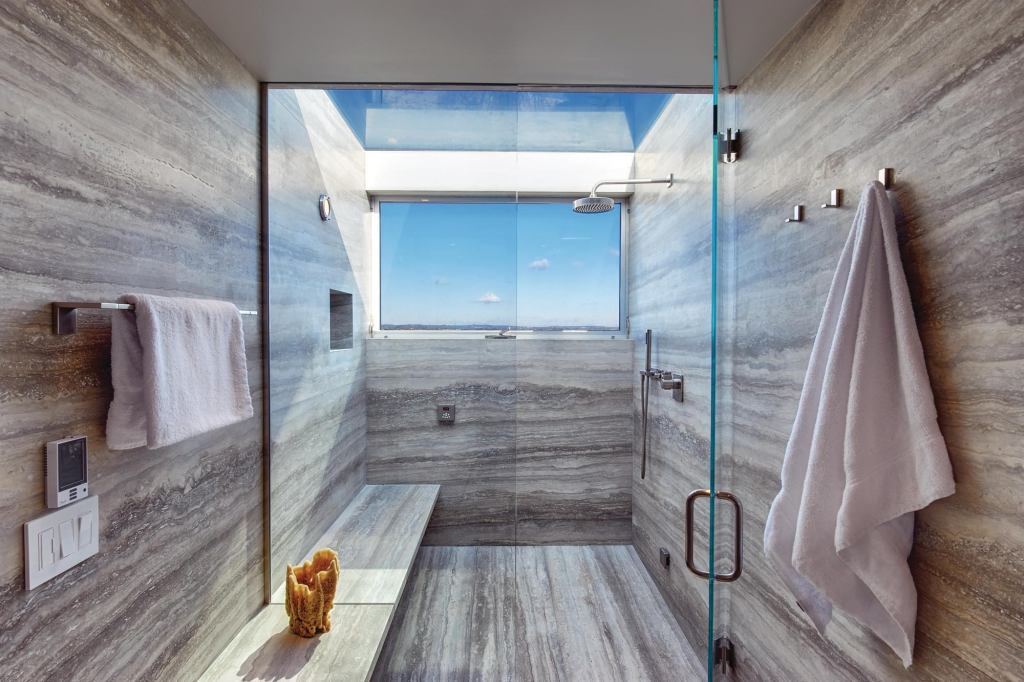 The room is about materials, but the idea is simplicity, rather than the excitement of different materials combined. Details such as condensation gutters, flashings, and curbs are out of sight, so all that’s visible is stone meeting glass. The shower’s skylight and window give a feeling of merging with the water and allow light to travel throughout the room. The marble’s striations resemble the sand at low tide. Its gray looks like the ocean when the sun goes behind a cloud. “If attention to details can permeate the big picture,” says Lomont, “that’s success.”