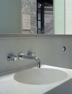 The rejuvenated Brewhouse’s hard-edged aesthetic is echoed in the bath, where polished surfaces stand in contrast to the chunky interior stone walls. Like the kitchen/living room relationship, the bath is largely open to the adjoining master bedroom. And, again, seamlessness is the operative idea. “The scale of things is large, so we didn’t want a lot of fine detail,” Clegg explains. Everything—from the wall-mounted toilet to the recessed mirror and lighting—was chosen for its clean design ethos. Limestone on the floor folds upward behind the toilet and reappears above the washbasin backsplash, which is covered in clear mosaic glass tiles. “We picked stuff that was quite angular rather than curved,” Clegg says. “Everything is very rectilinear, which has to do with the planes in the space.”