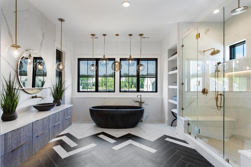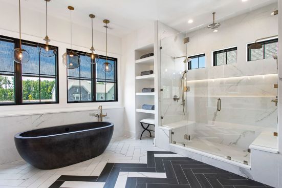 For the master bathroom upstairs, the team continued the home’s central black and white palette, beginning with the tiled floor. At the entrance, black 6-by-24-inch tiles were laid in a traditional herringbone pattern and point users into the space. The tile slowly transitions to white 6-by-24-inch tiles by the freestanding dark concrete tub to add contrast. The team also achieved continuity by utilizing the same white tile in 24-by-24-inch stacked pieces in the glass shower.