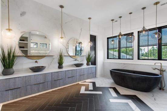 Opposite the shower, a long vanity—with sphere-shaped lighting pendants and circular mirrors—floats above the floor and allows the unique patterned tile to continue underneath.