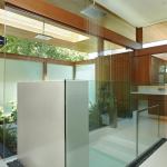 This renovation blew the lid off a dark, unremarkable master bath. The new roof floats above high fixed glass, while the room’s redwood-paneled walls extend outdoors to enclose a private courtyard topped by an open-air skylight. “It’s one single wet space with this glazing line that slices through it,” explains architect David Montalba. The garden wall, glazed with semi-transparent panels, reads as the room’s exterior boundary. The white terrazzo floor inside makes a subtle transition to acid-washed concrete at the courtyard, furthering the impression of indoor/outdoor space.