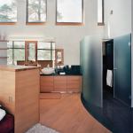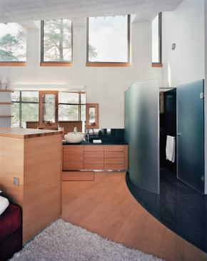 Helineva describes the site—and, in fact, the entire country—as one big rock, so granite was a natural choice for both exterior and interior finishes. The countertops, backsplash, and shower walls are composed of polished black granite. A smaller, striped granite tile covers the wet-area floors, then continues into the foyer. As in the kitchen, smooth oak millwork and flooring provide a soothing contrast to the pale, textured concrete walls and ceiling. According to Helineva, the earthy finishes were speced in thick, heavy proportions to anchor the light-filled soaring spaces and to encourage a feeling of shelter from the harsh terrain just beyond the glass.