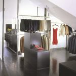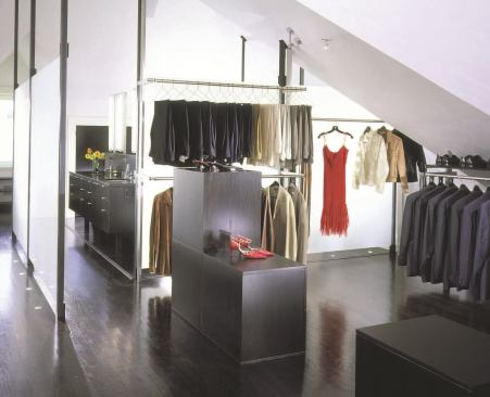 It was clear from the beginning that all walls were out. Nothing should interrupt the wild ceiling forms. However, something was needed to provide the requisite privacy of a bath and dressing area. After much bouncing around of ideas, Lundberg suggested letting the clothes themselves act as screens. Since no one wants soggy clothes, translucent glass acts as a physical barrier. The only things touching floor or ceiling are thin steel rods. Clothes racks cantilever out from the rods, which also support the glass screens, vanity cabinets, and two mirrors.
