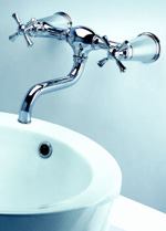 New to the Hatteras collection of faucets, the wall-mount lavatory faucet features cross handles and bell-shaped handle bases. Constructed of solid brass, the Hatteras wall-mount faucet is available in antique nickel and bronze finishes, as well as polished chrome, brushed nickel, and platinum nickel. Jado. 800.227.2734. www.jadousa.com.Circle 180