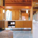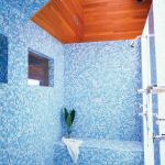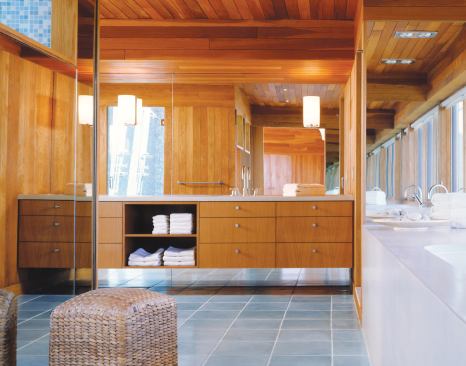 An elevated tub now hugs the outside wall. A large two-place shower stands in the center of the room, sharing the tub’s ocean view through a pair of high windows of its own. Goolrick converted the original shower to a steam room, relocated and reduced two oversize toilet compartments, and replaced two separate sink stations with a single 20-foot-long concrete-topped vanity. Faced in oak to match the original ceiling and wall paneling, the cabinet floats against a wall that is mirrored both above and below it. Other materials—watery blue ceramic tiles at the floor, blue glass tiles in the shower—reflect the house’s proximity to the sea. “Almost anywhere you are in here you see the ocean,” Goolrick says, “so it’s really pulled into the room.” Our judges approved. “I could picture myself going into this bath in the morning,” said one. “It gives you a good feeling.”
