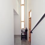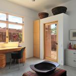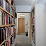 One of Browne’s budget-cutting strategies is to build the house framing to accommodate standard-sized materials such as the factory-made cabinets to the left of the door soffit, which create simple but elegant storage for the home’s wireless network setups.