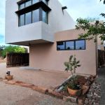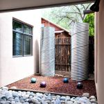 The water catchment system consists of two vertical culvert cisterns that hold 300 gallons of water each from the winter rains. A courtyard separates the detached studio from the rest of the house.