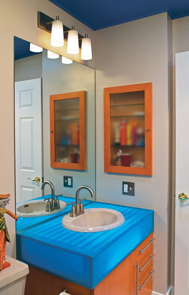 Redoing a bathroom on a tight budget is a common challenge given to residential designers. Architect Stanley Moore of Ann Arbor, Mich.-based Wright Street Design Group found a way to make economical more eye-catching by reusing what he could yet creating something original with this luminescent vanity. “Since it is a kids’ bathroom,” says Moore, “we thought this translucent resin would introduce a little sparkle and work as built-in night light.” It took some experimenting to find just the right type of light (low-voltage fluorescent bulbs) with the best configuration. Six fixtures are placed symmetrically beneath the surface to produce a glowing cube. Irregular luminosity from multiple fixtures bugged the architect, however. His unexpected solution was to stick tape under the counter in horizontal strips. Moore says the simple addition “camouflaged the uneven light and added interest.” Other inexpensive but effective ideas include moving the existing mirror down flush with the vanity to reflect the indigo glow as well as painting the ceiling a similar hue. A translucent medicine cabinet along with a sky tube further the cause of illumination.