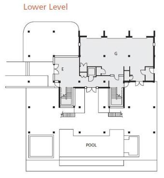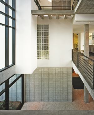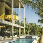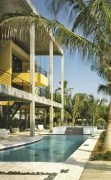 The living-cube walls are concrete block masonry with stucco on the outside and gypsum board on the inside, but other areas celebrate the finish qualities of naked concrete. Connecting “bridges” between the cubes are floored with a ¾-inch topping of pigmented concrete bonded with the structural slab. Ground-floor walls are laid up with a ground-face concrete block with black flecks. The pool deck and the house’s extensive porches and terraces are topped with acid-washed tabby, a traditional light concrete with oyster shell aggregate.