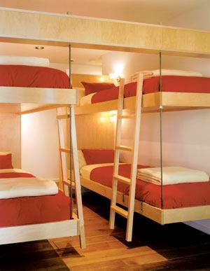 This Wisconsin lake house was designed by an architect for his extended family. Jim Nagle wanted a simple place that would feel as cozy for two as for 12, so he used built-in bunks as efficient extra sleeping quarters. These four floating beds and their walls were designed as a single piece of cabinetry. Blonde wood encloses the bunks, lending physical support plus privacy. The wood surround stops short of the ceiling while beds and ladders float above the hickory floor, giving the illusion of a larger space. The unit stands within a larger gathering room with its own screened porch. Builder: Design Specialty Builders, Green Lake, Wis.; Architect/owner: James L. Nagle, Nagle Hartray Danker Kagan McKay Penney Architects, Chicago; Photographer: Bruce Van Inwegen.
