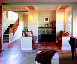 “The inglenook really became the heart of the house,” says architect Barbara Brown. “Everything circulates around this area.” Brown placed the nook in the approximate center of the footprint and organized the entry, stairwell, living room, and kitchen around it. The 7-foot-long benches are constructed of solid cherry to match other cabinetry and millwork in the house. Rough-sawn cedar planks, also used as exterior siding, demarcate the ceiling just above the nook to give the area distinction without closing it in. Detailing in the terra-cotta floor tile pattern also helps to define the recess while allowing it to integrate freely with adjacent rooms. The fireplace surround of sage green ceramic tiles interspersed with real copper accents enlivens Brown’s understated design.
