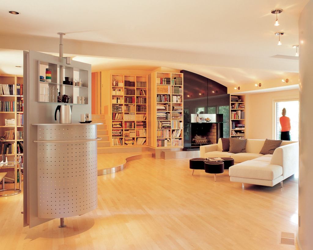 Turning a 1975 split-level’s warren of small rooms into an airy plan with crisp details was top priority for the owners of this Lake Michigan waterfront house. A completely open public area makes sense for capturing views, but the clients also wanted a place to escape. A swiveling coffee bar satisfied their craving for a partially partitioned nook as well as a close-by caffeine fix. The perforated aluminum bar cradles concave shelves on its flip side, while open cubbies above let the light flow through. Builder Richard Ruvin of Milwaukee-based Ruvin Brothers Artisans & Trades likes how the bar’s curve accentuates the barrel-vault ceiling and S-shaped platform that subtly define the home’s foyer. Ruvin worked with architect Tom Hoffman to find “something light and architectural that would enable us to break down the big, open space and to define a corner as a study without closing it off.” The brushed aluminum is repeated on the stair risers, and the thin profile of the steel cubbies mimics the fixed maple shelving that lines three walls. The 42-inch-wide-by-84-inch-tall bar also locks into place for spill prevention.