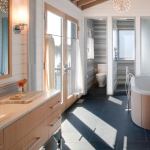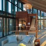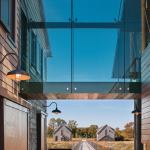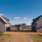 Modern-day local regulations stipulated that any additional buildings would have to sit at least 100 feet away from the coastline. Overmyer obliged with a pair of new garages that act as an entry gate for those arriving by car. Once visitors have parked, they walk or ride a golf cart over a 375-foot-long access bridge to the main house, traversing upland areas, wetlands, and a shallow tidal pond. The bridge slices in between the main house’s two portions, ending at the water’s edge.