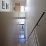 The interior is marked by open spaces, clean lines, and radiant-heated floors. A staircase promotes passive heating and cooling by channeling hot air up and out through windows at either end of the stair runs. Though the building is decidedly modern, it plays nicely with its neighbors in material (brick) and scale.