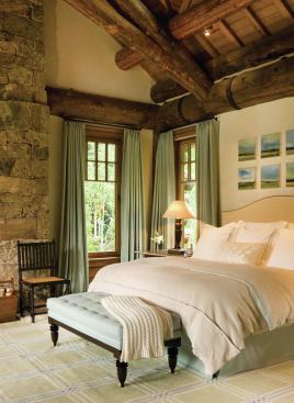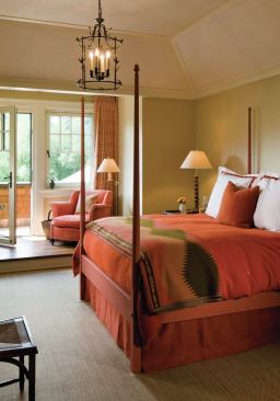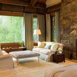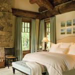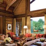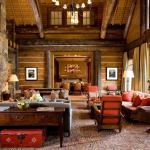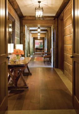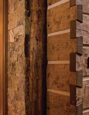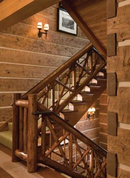 Further grounding the building in its mountain milieu, Gassett wrapped the exterior materials into the interior. The central living room’s stone chimney rises to a high log-trussed roof, which caps walls that combine round and flat-hewn logs. Rather than lay up a conventional log structure, builder Steve Hansen framed the building conventionally and his log-crafting subcontractor lag-bolted halved logs to the studs from behind. The hybrid system yielded the best of both worlds, Hansen explains. In addition to the traditional look, “we got better insulation value and chases for the wiring.” Moving outward from the living room, the interior becomes somewhat more refined, with hewn logs giving way to milled paneling and paint. But in both architecture and interior design, the regional flavor remains strong enough for one to locate this house without even a glance out the window.