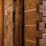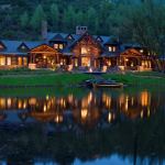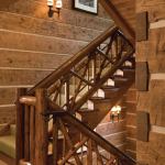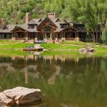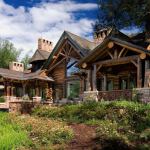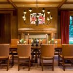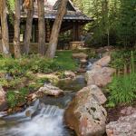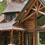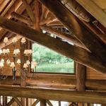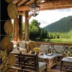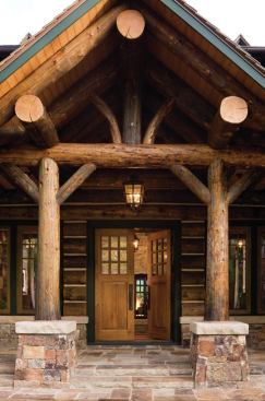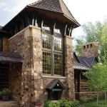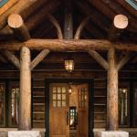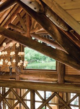 The building’s stacked-log walls rest on a stone masonry plinth, which sprouts upward into tapering column bases and chimneys and the buttressed stair tower that flanks the entry. Giving equal heft to the wood elements, Gassett specified Engelmann spruce logs up to 18 inches in diameter. Log trusses grace the open gables of the porches that wrap three sides of the house. “There are a number of different kinds of outdoor spaces,” Gassett says. A stone deck bookended by two roofed pavilions spans the building’s south-facing elevation. Stone stairs descend along the building’s north-south axis to a hot tub patio, then to a boat dock that projects into the pond. A more private porch, with an outdoor fireplace, extends the kitchen wing toward the stream.
