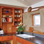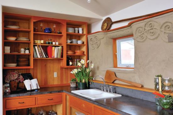 Straw bale and earthen plaster were locally available and became the primary ingredients on the conservation side. Using 18-inch straw bales as building blocks rendered insulation values between R-35 and R-43 and, combined with blown-in cellulose R-50 insulation and fiberglass windows, produced a pretty tight shell for each little house. South-facing windows were specified to capture the sun’s warmth, while the north elevations were padded with extra insulation to keep out the cold. All of the homes have solar hot-water systems, timed fans for ventilation, low-flow plumbing fixtures, and high-efficiency lighting.