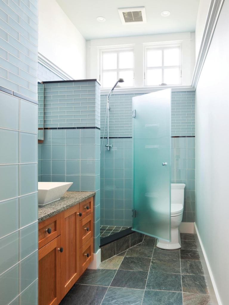 Expanding the 52-square-foot space outward to create a bigger footprint was not an option, so Bubnowski and builder Glenn Oakley pushed into the attic to create a taller 9’6” ceiling. This move created an extra tier of wall area for clerestory windows (which bring in natural light and ventilation). Bumping those windows up and eliminating the original window, which had been positioned at eye level, freed up wall space for a corner shower in place of the room’s original cramped tub.