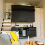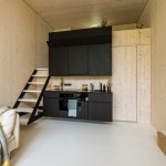 The home consists of a small living room area in front of the glass wall, with a kitchen at the back of the first floor. A ladder leads up to a walled platform above the kitchen space with space for a bed.