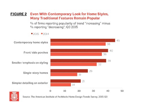 In residential design, contemporary-style homes are growing in popularity, charting a seven point increase this year with 45% compared to 38% last year. While homeowners are adopting a more upscale aesthetic, keeping the structure low-maintenance remains an important factor when choosing exterior materials. More favored trends include single-story layouts, adding front or side porches, and smaller, more simple spaces that emphasize styling.