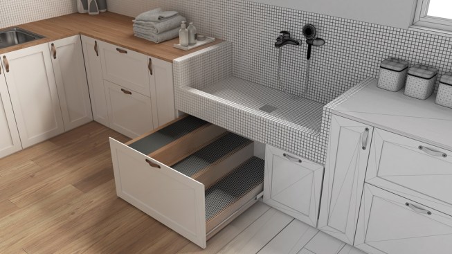 Food and water dishes can take up a lot of room and be messy. The answer is to install a built-in feeding system. There are stylish, creative solutions, including pull-out drawers in the underused toe-kick space in the kitchen cabinetry or a built-in feeding system as part of the kitchen island.