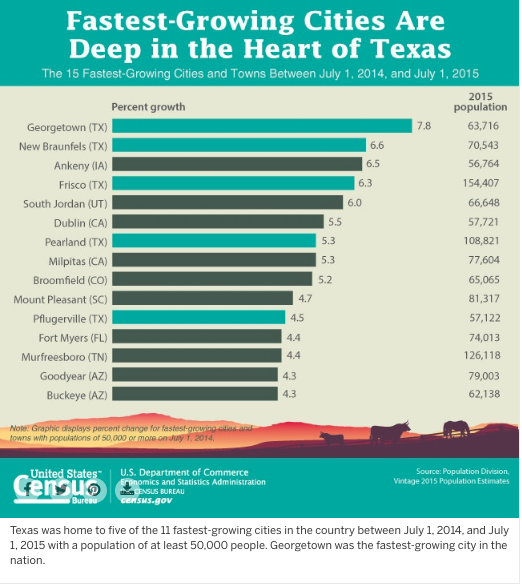 Georgetown is part of the Austin-Round Rock metro area, which crossed the 2 million population threshold in 2015 for the first time, according to statistics released earlier this year. The metro area is also home to Pflugerville, the nation’s 11th fastest-growing large city. Austin itself added more people over the period (19,000) than all but seven other U.S. cities. Texas was home to five of the 11 fastest-growing cities between July 1, 2014, and July 1, 2015 (New Braunfels, Frisco and Pearland were the others), and five of the eight that added the most people (Houston, San Antonio, Fort Worth and Dallas were the others).
