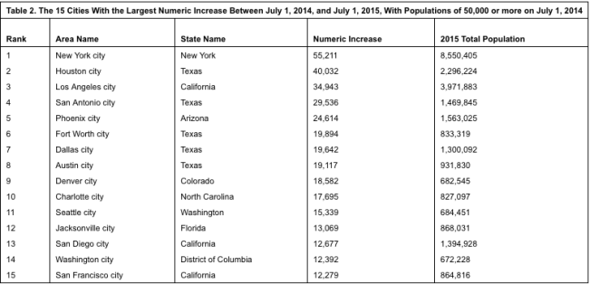 - Aside from New York, each of the 15 cities that gained the highest number of people between 2014 and 2015 were in the South or West. Three were in California (Los Angeles, San Diego and San Francisco).