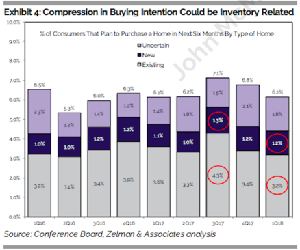 One of the intriguing conclusions Zelman derives from the variously sourced consumer sentiment data points is that, writ large, confidence directionals that run counter to the interests of some parts of the housing spectrum may actually favor others. What’s a negative for existing home sales and apartment rentals–vis a vis confidence–may be a positive for new home sales. Here’s the Zelman conceit: