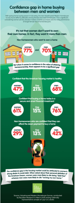It is not that women don’t want to own their own homes. In fact, they want them more: according to the ValueInsured Modern Homebuyer Survey, 77% of women who don’t own a home say they would like to buy a home compared to just 70% of men. But when it comes to confidence in the value of attaining home ownership, there appears to be a significant confidence gap: